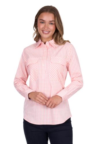 Half placket 2-pocket long sleeve shirt, one with pen holder, logo buttons, contrast print inside collar stand and sleeve cuffs